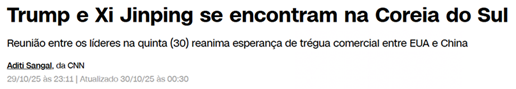 SE13977 - (Siga Escrevente. 2025. Inéditas) Os presidentes dos Estados Unidos, Donald Trump, e da China, Xi Jinping, encontraram-se em um momento de tensões comerciais reacendidas. O encontro, o primeiro presencial no segundo mandato de Trump, visou a um acordo para gerir as relações econômicas.