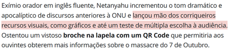 SE13943 - (Siga Escrevente. 2025. Inéditas) Em seu discurso desafiador na Assembleia-Geral da ONU, o primeiro-ministro Benjamin Netanyahu utilizou diversos recursos visuais para reforçar sua mensagem. Ele fez uso de um acessório pessoal para direcionar os ouvintes a obterem mais informações sobre o ataque de 7 de outubro.