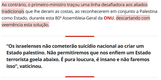 SE13944 - (Siga Escrevente. 2025. Inéditas) O primeiro-ministro de Israel, Benjamin Netanyahu, realizou um discurso na 80ª Assembleia-Geral da ONU em um ambiente de hostilidade e profundo isolamento mundial. Em sua fala, ele abordou a questão da criação de um Estado palestino.