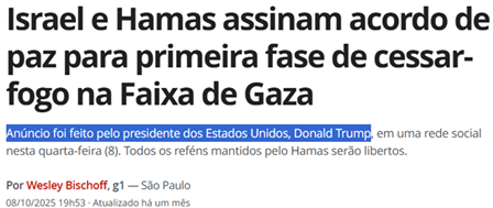 SE13969 - (Siga Escrevente. 2025. Inéditas) Israel e o grupo terrorista Hamas assinaram um acordo de paz de três fases, mediado por países como Catar, Egito e Turquia. A notícia sobre a assinatura e os termos da primeira fase foi rapidamente disseminada, gerando reações em todo o mundo.