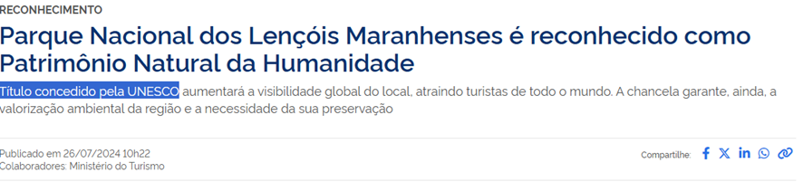 SE11545 - (jul/24) O Parque Nacional dos Lençóis Maranhenses, localizado no Maranhão, foi recentemente reconhecido como Patrimônio Natural da Humanidade.