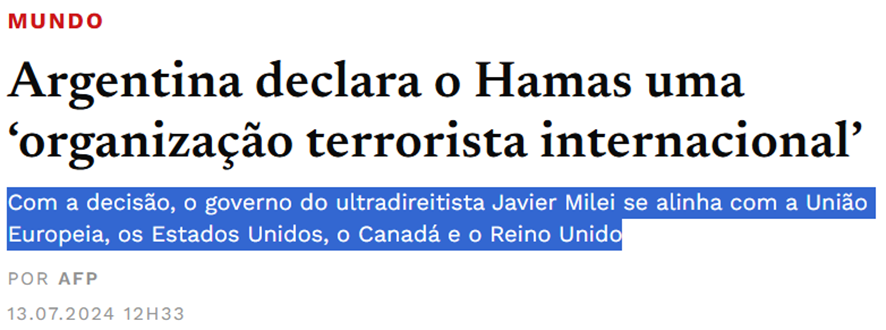 SE11541 - (jul/24) O governo da Argentina, sob a liderança de Javier Milei, declarou o Hamas como uma organização terrorista internacional.