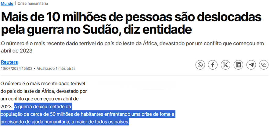 SE11543 - (jul/24) Desde o início da guerra no Sudão em abril de 2023, mais de 10 milhões de pessoas foram deslocadas, representando aproximadamente 20% da população.