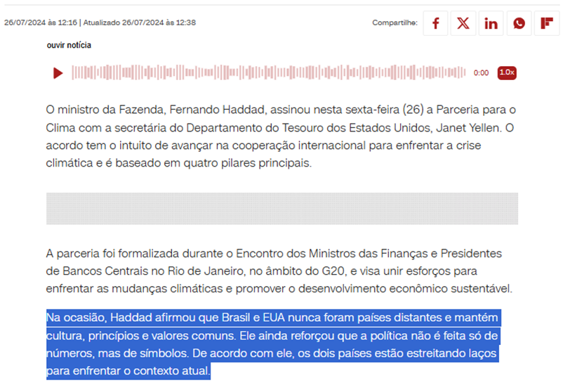 SE11536 - (jul/24) Brasil e Estados Unidos firmaram uma Parceria para o Clima, assinada pelo ministro da Fazenda brasileiro, Fernando Haddad, e pela secretária do Departamento do Tesouro dos Estados Unidos, Janet Yellen. Esse acordo foi formalizado durante o Encontro dos Ministros das Finanças e Presidentes de Bancos Centrais no Rio de Janeiro, no âmbito do G20.