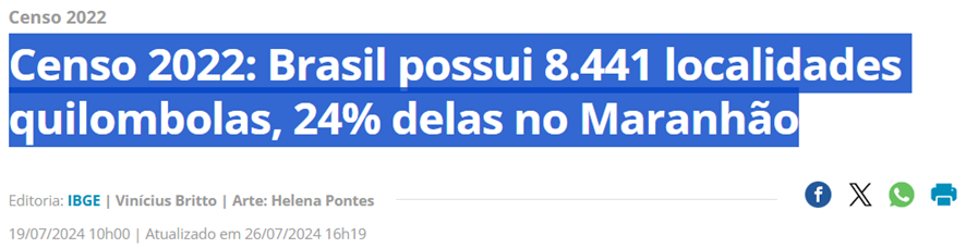SE11538 - (jul/24) De acordo com o Censo Demográfico de 2022, o Brasil tinha 8.441 localidades quilombolas.