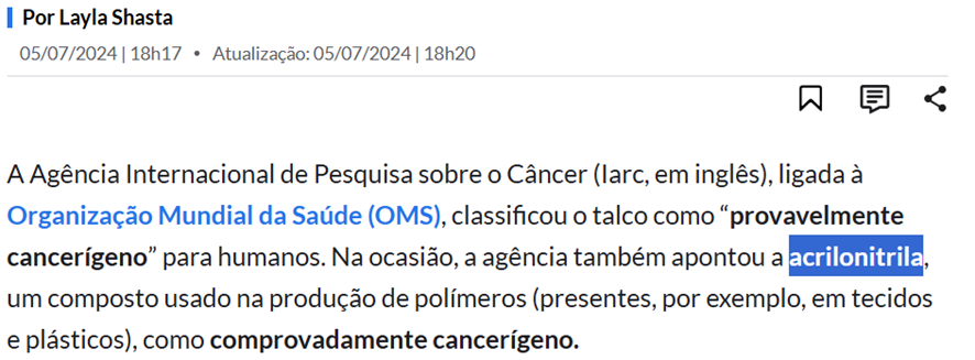 SE11539 - (jul/24) A Agência Internacional de Pesquisa sobre o Câncer (IARC), ligada à Organização Mundial da Saúde (OMS), classificou recentemente o talco como "provavelmente cancerígeno" para humanos.