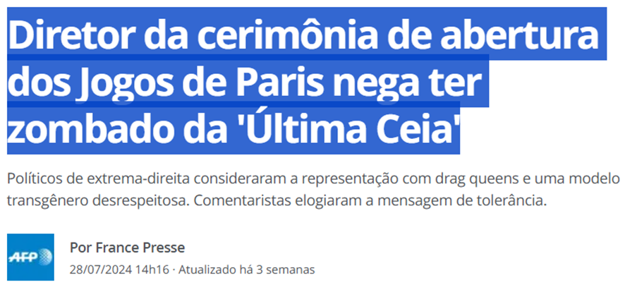 SE11544 - (jul/24) A cerimônia de abertura das Olimpíadas em Paris gerou polêmica devido a uma cena que foi interpretada por alguns como uma referência à "Última Ceia".
