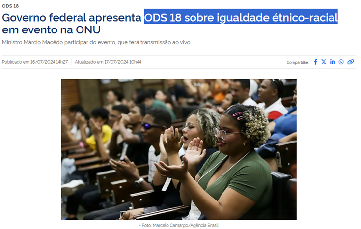 SE11540 - (jul/24) O governo federal brasileiro criou o Objetivo de Desenvolvimento Sustentável (ODS) 18, apresentado durante o Fórum Político de Alto Nível na ONU em Nova York.