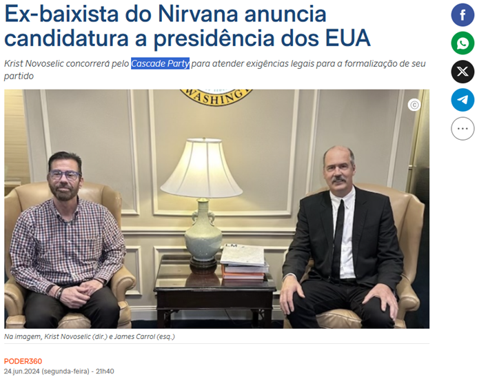 SE11466 - (jun/24) Membro fundador do Nirvana, o baixista Krist Novoselic anunciou ser o mais novo candidato à presidência dos Estados Unidos. O músico concorreria com o atual presidente Joe Biden e o republicano Donald Trump.