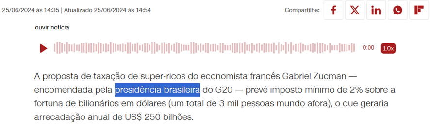 SE11465 - (jun/24) A proposta de taxação de super-ricos do economista francês Gabriel Zucman — encomendada pela ______________ do G20 — prevê imposto mínimo de 2% sobre a fortuna de bilionários em dólares (um total de 3 mil pessoas mundo afora), o que geraria arrecadação anual de US$ 250 bilhões.