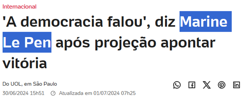 SE11460 - (jun/24) O líder do partido de extrema direita francês RN (Rassemblement National, Reunião Nacional em português), comemorou o resultado das eleições legislativas após a divulgação das primeiras projeções.