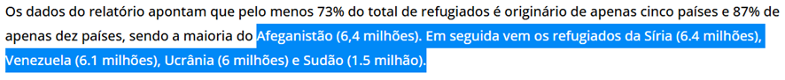 Os dados do relatório apontam que pelo menos 73% do total de refugiados é originário de apenas cinco países e 87% de apenas dez países, sendo a maioria do