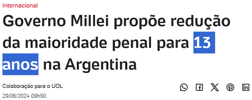 SE11461 - (jun/24) O governo Javier Milei apresentou ao Congresso argentino um projeto de lei penal que visa endurecer as punições para crimes cometidos por menores de idade.