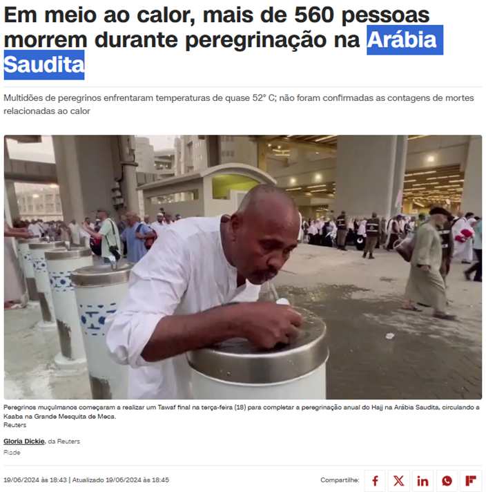 SE11456 - (jun/24) O calor extremo é o mais novo desafio para centenas de pessoas que iniciaram a peregrinação anual do Hajj na sexta-feira (14). Quase 2 milhões de muçulmanos completam a jornada para a Grande Mesquita na cidade mais sagrada, na quarta-feira (19).