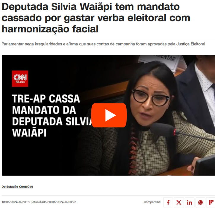 SE11458 - (jun/24) O Tribunal Regional Eleitoral do Amapá (TRE-AP) cassou, por unanimidade, o mandato da deputada federal Silvia Waiãpi (PL-AP) por utilização de verba pública de campanha eleitoral para fins pessoais durante as eleições de 2022, quando ela foi eleita para uma vaga na Câmara dos Deputados.