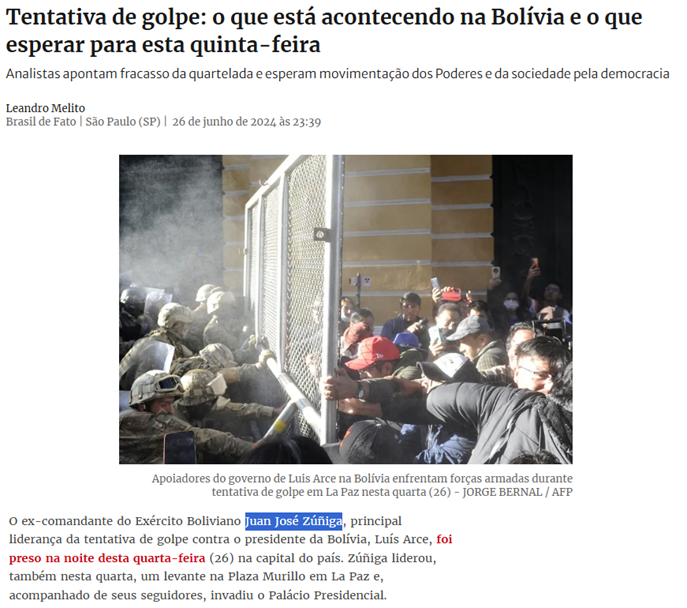 Fontes bolivianas ouvidas pelo Brasil de Fato apontam que o episódio foi uma tentativa de golpe fracassada, com baixa adesão dentro das Forças Armadas e rechaço da população, que se colocou em defesa da democracia na Plaza Murillo e outros centros urbanos do país.