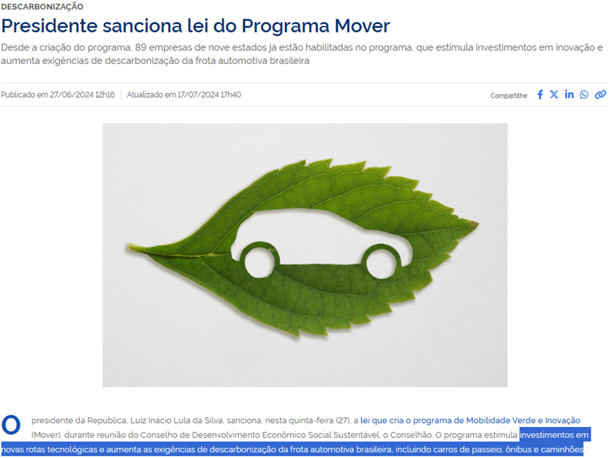 SE11450 - (jun/24) O presidente da República, Luiz Inácio Lula da Silva, sanciona, nesta quinta-feira (27), a lei n. 14.902/24 que cria o programa de Mobilidade Verde e Inovação (Mover), durante reunião do Conselho de Desenvolvimento Econômico Social Sustentável, o Conselhão.