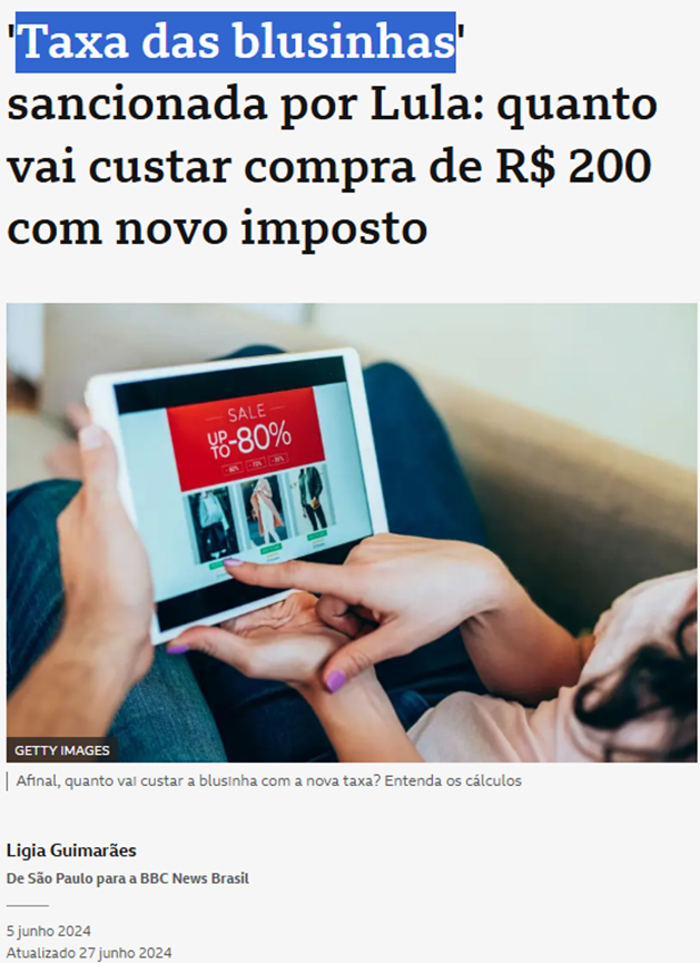 SE11454 - (jun/24) A taxa que estabelece a cobrança de imposto de importação para compras internacionais de até US$ 50 (R$ 276), já tem data de início definida no Brasil: o dia 1º agosto.