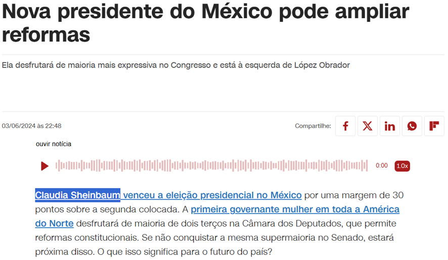 SE11452 - (jun/24) A primeira governante mulher em toda a América do Norte desfrutará de maioria de dois terços na Câmara dos Deputados, que permite reformas constitucionais. Se não conquistar a mesma supermaioria no Senado, estará próxima disso.