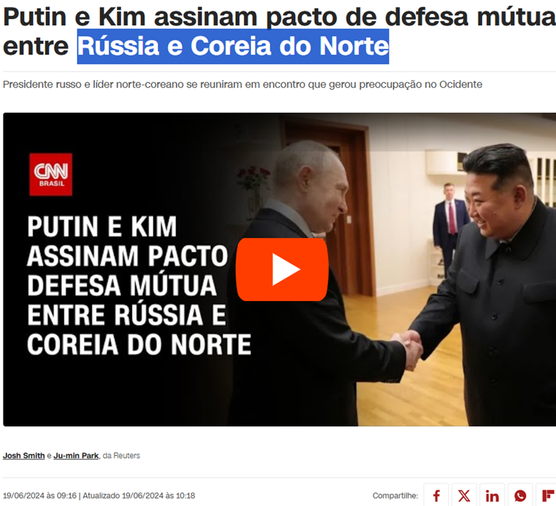 SE11448 - (jun/24) Os líderes dessas nações assinaram um acordo nesta quarta-feira (19) que aprofunda sua cooperação militar para incluir uma promessa de defesa mútua para ajudar um ao outro em caso de ataque, com um dos presidentes envolvidos chamando os novos laços de “aliança”.