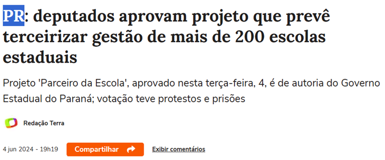 SE11447 - (jun/24) Os deputados aprovaram o Projeto de Lei 345 de 2024, de autoria do Governo Estadual, que prevê a terceirização da gestão de 204 escolas estaduais. Foram 38 votos favoráveis e 13 contrários à aprovação da medida. Agora, o projeto segue para sanção do governador, que celebrou a aprovação na Câmara em suas redes sociais.