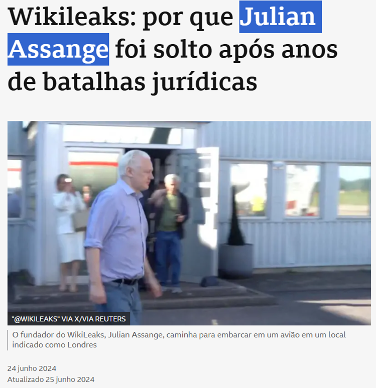 SE11449 - (jun/24) O fundador do Wikileaks, declarou-se culpado de acusações criminais nos Estados Unidos como parte de um acordo que lhe permitiu ser libertado da prisão na noite desta segunda-feira (24, no horário do Brasil).