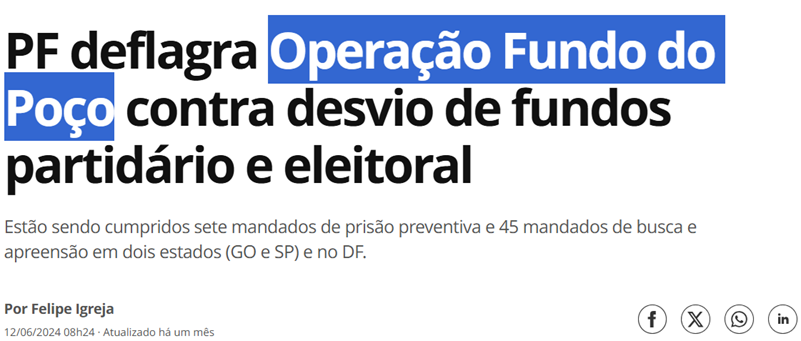 SE11453 - (jun/24) A Polícia Federal deflagrou nesta quarta-feira (12) uma operação, com o objetivo de desarticular organização criminosa responsável por desviar e se apropriar de recursos do fundo partidário e eleitoral nas eleições de 2022.