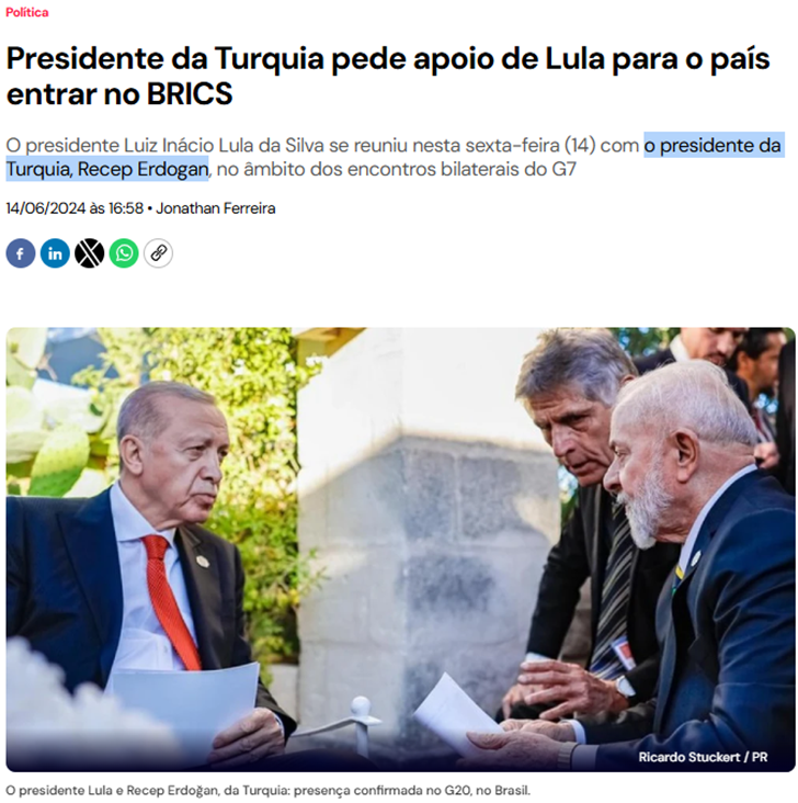 SE11451 - (jun/24) O presidente Luiz Inácio Lula da Silva prometeu apoiar a candidatura da nação para ingressar ao grupo de países do BRICS, do qual o Brasil faz parte como membro fundador. Lula se encontrou nesta sexta-feira (14) com o líder do país interessado, na Itália, onde participou da reunião de cúpula do G7.