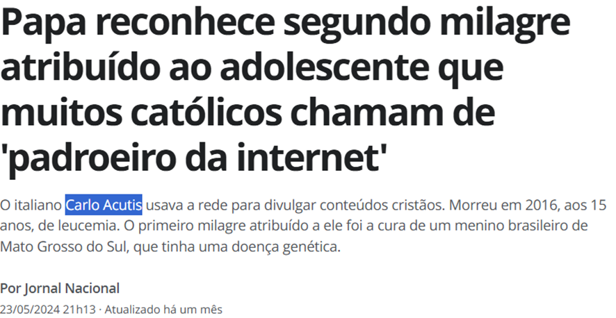 SE11350 - (mai/24) O Papa Francisco recebeu em audiência na manhã desta quinta-feira, 23 de maio, o prefeito do Dicastério das Causas dos Santos, Card. Marcello Semeraro. O Pontífice autorizou a publicação de alguns decretos, entre quais consta o reconhecimento do milagre atribuído à intercessão do Beato.
