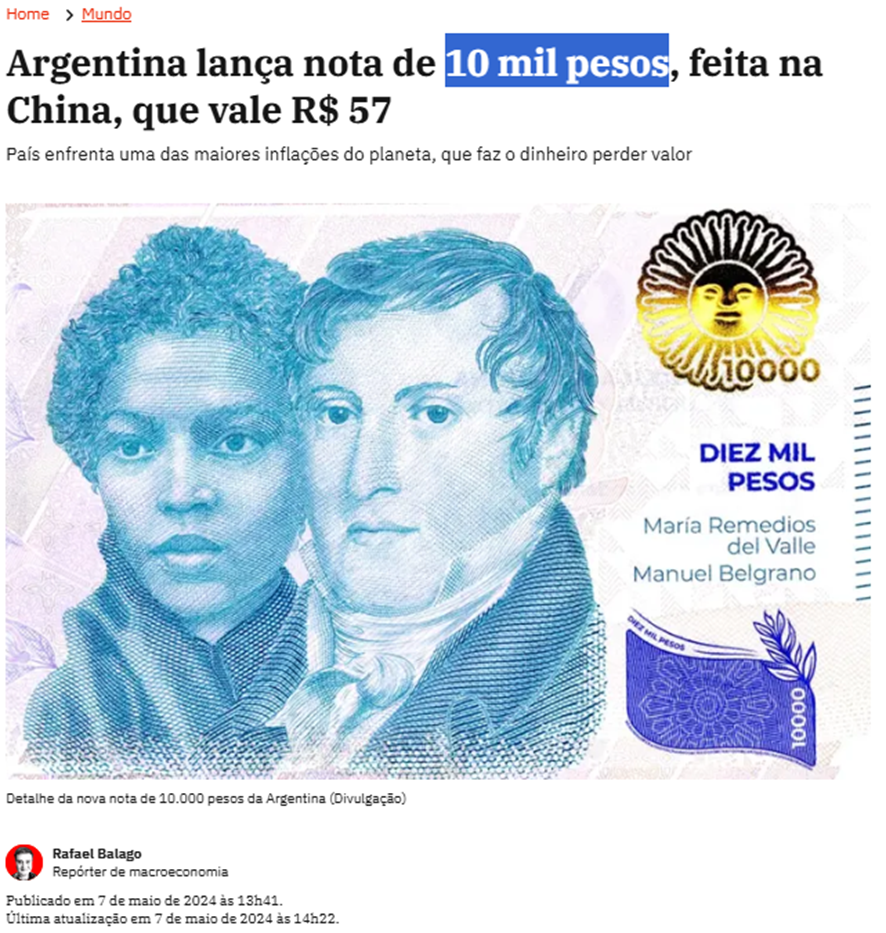 SE11352 - (mai/24) O Banco Central da Argentina (BCRA) colocou em circulação uma nova cédula, o maior valor emitido até agora.
