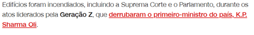 SE13931 - (Siga Escrevente. 2025. Inéditas) Os protestos contra a corrupção e a economia fraca no Nepal ganharam destaque pela intensidade dos atos, que incluíram a destruição de prédios públicos e a renúncia do primeiro-ministro. Os manifestantes mais jovens foram identificados como os principais líderes desses atos.