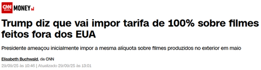 De acordo com a notícia, qual é a porcentagem da tarifa que Donald Trump disse que vai impor "sobre todo e qualquer filme feito fora dos Estados Unidos"?