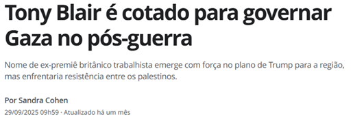 SE13935 - (Siga Escrevente. 2025. Inéditas) A mídia israelense tem noticiado um plano do governo dos EUA para a governança de Gaza no pós-guerra, que inclui a criação de uma Autoridade Internacional de Transição. Uma figura política europeia com bom trânsito entre Israel e países árabes está sendo cotada para liderar essa autoridade provisória.