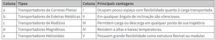 SE10669 - (Oficial Logística. 2018. FCC) A tabela a seguir apresenta alguns tipos de transportadores contínuos e suas principais vantagens: