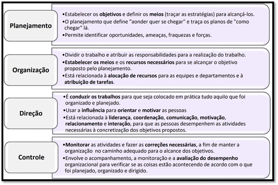 Planejamento, organização, direção e controle são considerados funções básicas e interdependentes na administração das organizações modernas.