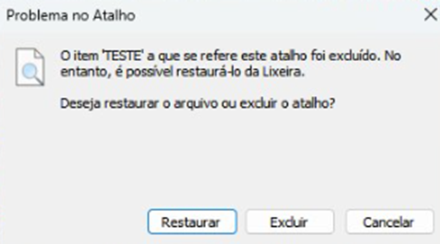 SE10318 - (Psicólogo Judiciário. 2024. Vunesp) Um usuário do MS-Windows 10, em sua configuração padrão, criou um arquivo chamado texto.txt na Área de Trabalho. Em seguida, criou um atalho chamado texto.lnk para esse arquivo, também na Área de Trabalho. Depois, enviou o arquivo texto.txt para a Lixeira. Ao dar um duplo clique com o botão principal do mouse sobre o arquivo texto.lnk, será