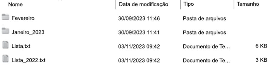 Um usuário, ao clicar com o botão principal do mouse sobre o arquivo Lista.txt e arrastá-lo para a pasta Fevereiro, consegue executar a operação com sucesso. No entanto, ao clicar com o botão principal do mouse sobre o arquivo Lista_2022. txt e arrastá-lo para a pasta Janeiro_2023, obtém uma mensagem de erro e não pode, assim, concluir a operação de forma automática.