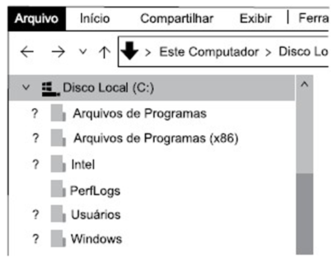 SE10321 - (Auditor Fiscal Tributário. 2023. Vunesp) A imagem a seguir mostra o canto superior esquerdo da tela do programa Explorador de Arquivos, integrante do MS-Windows 10 em sua configuração padrão, que está sendo utilizado por um usuário para visualizar o conteúdo do disco rígido de seu computador: