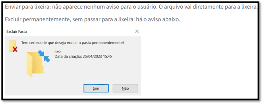 SE10322 - (Analista. 2023. Vunesp) Ao organizar pastas e arquivos em seu computador local por meio do Explorador de Arquivos do MS-Windows 10, ambos em configuração padrão, um usuário selecionou uma pasta dentro da pasta Downloads e pressionou a tecla Delete (Del), mantendo a tecla Shift pressionada simultaneamente.