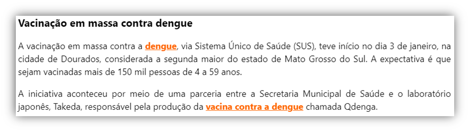 SE10224 - (jan/24) No dia 03/01/2024, teve início a vacinação em massa contra essa doença, via SUS, na cidade de Dourados, considerada a segunda maior do estado de Mato Grosso do Sul. A iniciativa aconteceu por meio de uma parceria entre a Secretaria Municipal de Saúde e o laboratório japonês, Takeda, responsável pela produção da vacina.