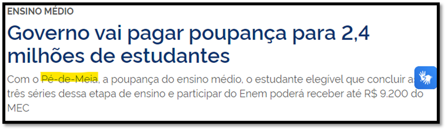 SE10227 - (jan/24) Em janeiro de 2024, foi publicada a notícia de que, a partir de março de 2024, estudantes de baixa renda matriculados no ensino médio regular das redes públicas e pertencentes a famílias inscritas no Programa Bolsa Família terão direito a um incentivo financeiro para cursarem e concluírem a última etapa da educação básica.
