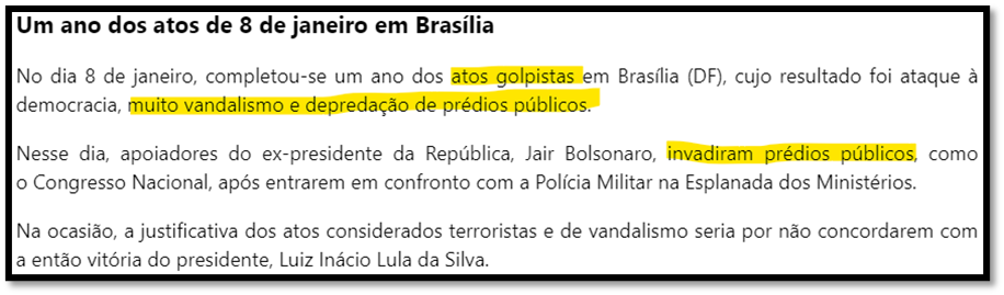 SE10225 - (jan/24) No dia 08/01/2024, completou-se um ano desse ato ocorrido em Brasília, Distrito Federal, por conta da eleição presidencial ocorrida em janeiro de 2023.