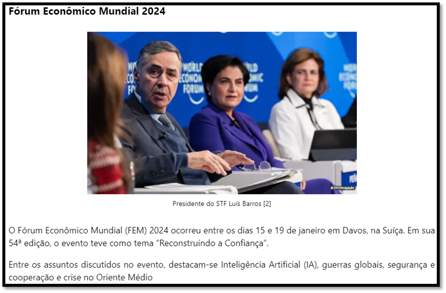 SE10228 - (jan/24) Esse evento mundial ocorreu entre os dias 15 e 19 de janeiro em Davos, na Suíça. Em sua 54ª edição, o evento teve como tema “Reconstruindo a Confiança”. Entre os assuntos discutidos no evento, destacam-se Inteligência Artificial (IA), guerras globais, segurança e cooperação e crise no Oriente Médio. O Brasil foi representado pelo presidente do Supremo Tribunal Federal (STF), Luís Roberto Barroso, e por ministros, como, por exemplo, Marina Silva, do Meio Ambiente.