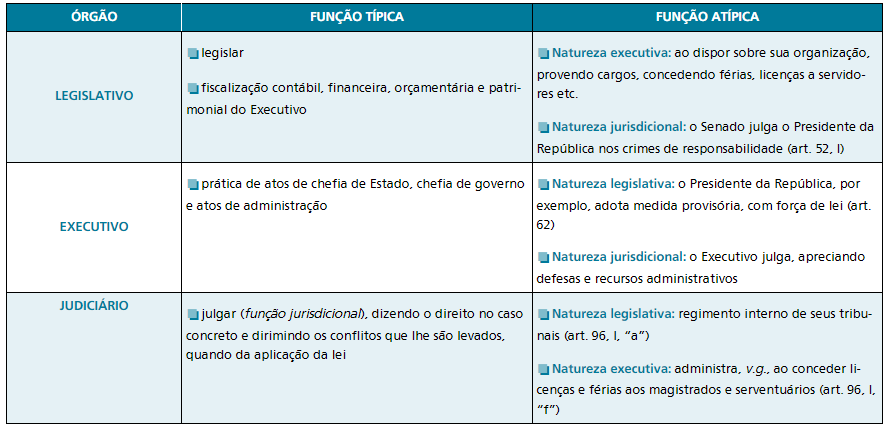 Além do exercício de funções típicas (predominantes), inerentes e ínsitas à sua natureza, cada órgão exerce, também, outras duas funções atípicas (de natureza típica dos outros dois órgãos). Assim, o Legislativo, por exemplo, além de exercer uma função típica, inerente à sua natureza, exerce, também, uma função atípica de natureza executiva e outra função atípica de natureza jurisdicional.