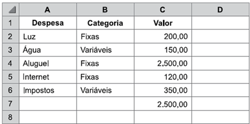 A célula C7 contém uma função, cujo resultado é 2.500,00.