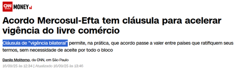SE13918 - (Siga Escrevente. 2025. Inéditas) O Mercosul e a Efta, bloco formado por Noruega, Suíça, Islândia e Liechtenstein, devem assinar um acordo de livre comércio que inclui uma cláusula para acelerar sua vigência. A medida tem como objetivo contornar possíveis impasses políticos e democráticos nos países envolvidos.
