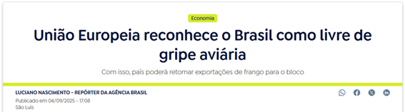 SE13914 - (Siga Escrevente. 2025. Inéditas) A União Europeia (UE) reconheceu o Brasil como livre da doença que havia motivado a suspensão das exportações de carne de frango para o bloco. O caso da doença foi registrado em uma granja comercial no Rio Grande do Sul.