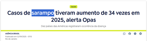 SE13911 - (Siga Escrevente. 2025. Inéditas) A Organização Pan-Americana da Saúde (Opas) emitiu um alerta após um aumento de 34 vezes no número de casos de uma doença altamente contagiosa nas Américas. A doença, que se espalha pelo ar e pode evoluir para complicações graves como pneumonia e cegueira, exige uma cobertura vacinal de no mínimo 95% para ser controlada.
