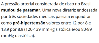SE13909 - (Siga Escrevente. 2025. Inéditas) Uma nova diretriz médica, divulgada no 80º Congresso Brasileiro de Cardiologia, reclassificou os valores de pressão arterial que antes eram vistos como "normais limítrofes". Essa mudança exige maior atenção médica e intervenção preventiva para evitar que a doença se instale totalmente.