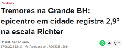SE13912 - (Siga Escrevente. 2025. Inéditas) O Brasil registrou dois tremores de terra com magnitudes de 2.9 mR e 2.5 mR em um estado que, historicamente, é o que possui o maior número de abalos sísmicos no país. Os abalos foram sentidos em diversas cidades em torno de um único centro urbano.